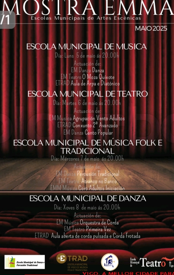 Luns 5 de Maio de 2025Mostra EMMA. Escolas Municipais de Artes Escénicas de Vigo. Do luns cinco ao xoves oito de maio. 20:00Hs.Hoxe luns cinco de maio as Escolas Municipais de Artes Escénicas de Vigo comezamos unha nova Mostra EMMA na que unha representación do noso alumnado amosará o seu traballo nas instalacións das catro escolas participantes. A enttrada eé libre e de balde ata completar aforamento.Deixámosvos o programa completo a desenvolver ata o xoves oito de maio.- LUNS 5/MAIO 20:00hs.Lugar. Escola Municipal de MúsicaActúan:Escola Municipal de Danza: DanzaEscola Municipal de Teatro: O moza QuixoteEscola Municipal de Música Folk e Tradicional: Aulas de Arpa Céltica e Diato. –